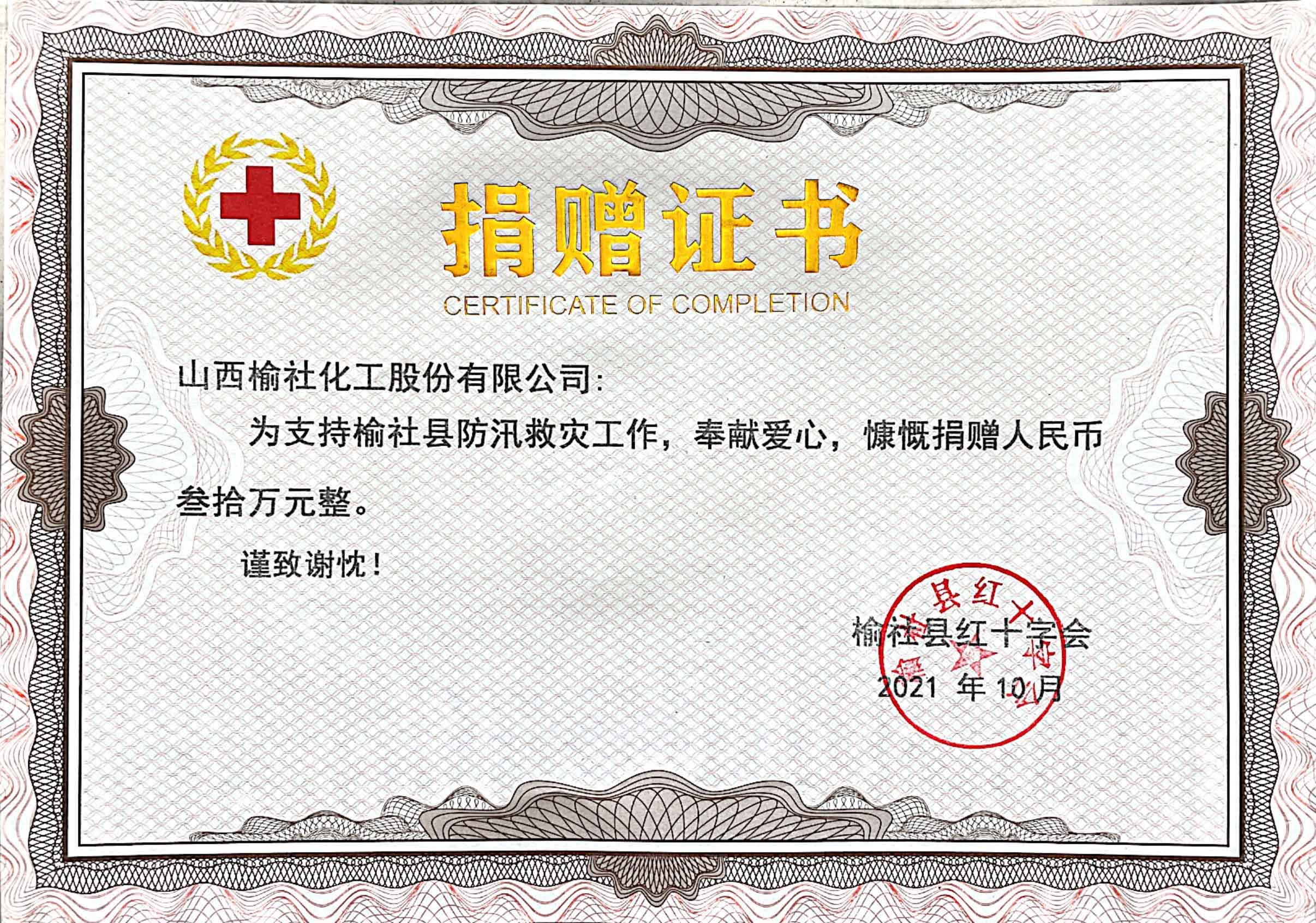 2021年榆社縣防汛救災捐贈證書