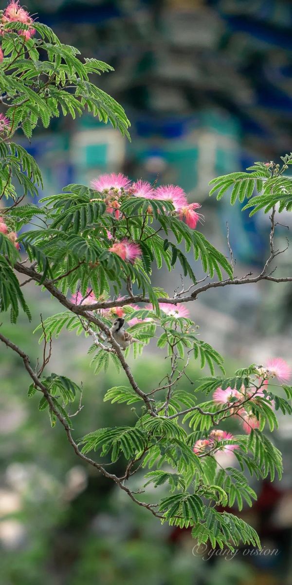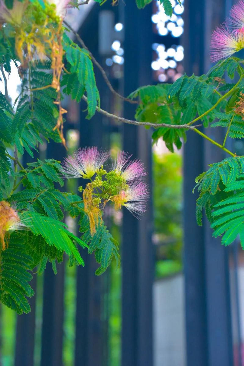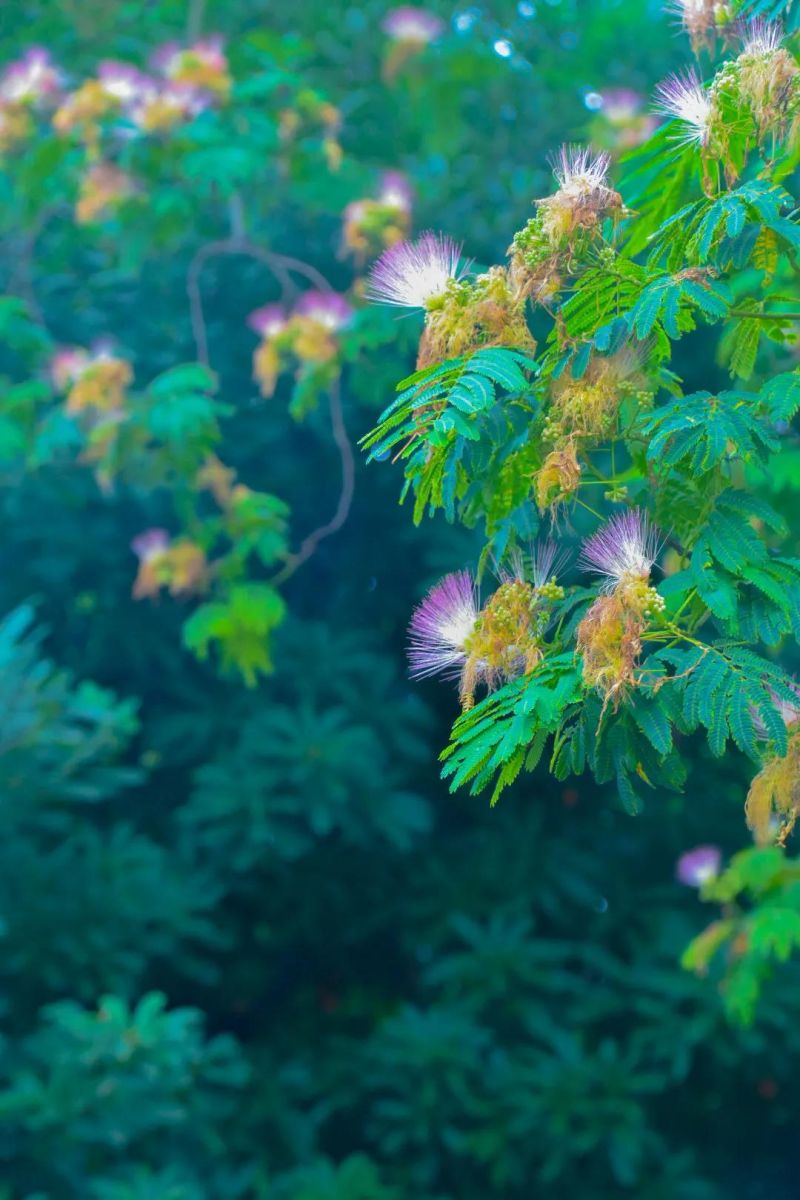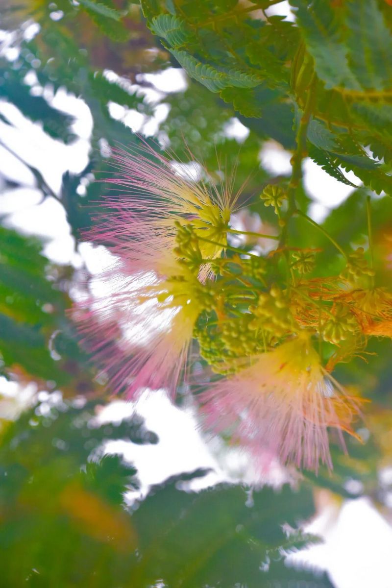 合歡樹也叫夜合歡、絨花樹。它的葉子兩兩相對(duì),晚上則會(huì)合抱一起;它的花瓣就像蒲公英,絲絲縷縷聚集而來(lái)。綻放時(shí)就像孔雀開屏,盡情地展開;凋零時(shí)花瓣全部閉合呈現(xiàn)成一把扇子狀,趁風(fēng)而歸,飄落到想去的地方。