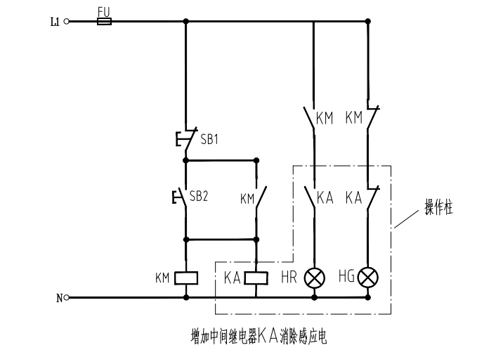 5、在操作柱內(nèi)安裝一個(gè)中間繼電器對(duì)感應(yīng)電進(jìn)行有效隔離,通過繼電器的常開常閉觸點(diǎn)控制設(shè)備的啟停指示燈(如圖所示),感應(yīng)發(fā)亮現(xiàn)象可有效避免。
