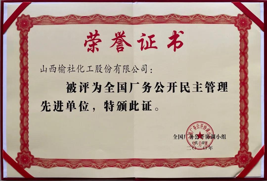 山西榆社化工股份有限公司通過開展企務(wù)公開、民主管理工作,促進企業(yè)廉政建設(shè),榮獲“全國廠務(wù)公開民主管理先進單位”榮譽稱號。