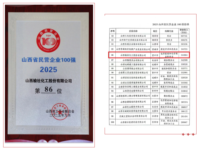9月18日,在“百?gòu)?qiáng)民企聚龍城、凝心聚力促轉(zhuǎn)型”2025晉商主題沙龍活動(dòng)現(xiàn)場(chǎng),省工商聯(lián)重磅發(fā)布“2025山西省民營(yíng)企業(yè)100強(qiáng)”“2025山西省民營(yíng)企業(yè)制造業(yè)30強(qiáng)”“2025山西省民營(yíng)企業(yè)服務(wù)業(yè)20強(qiáng)”系列榜單。公司再次榮登省民營(yíng)企業(yè)100強(qiáng)榜單,排名第86位。